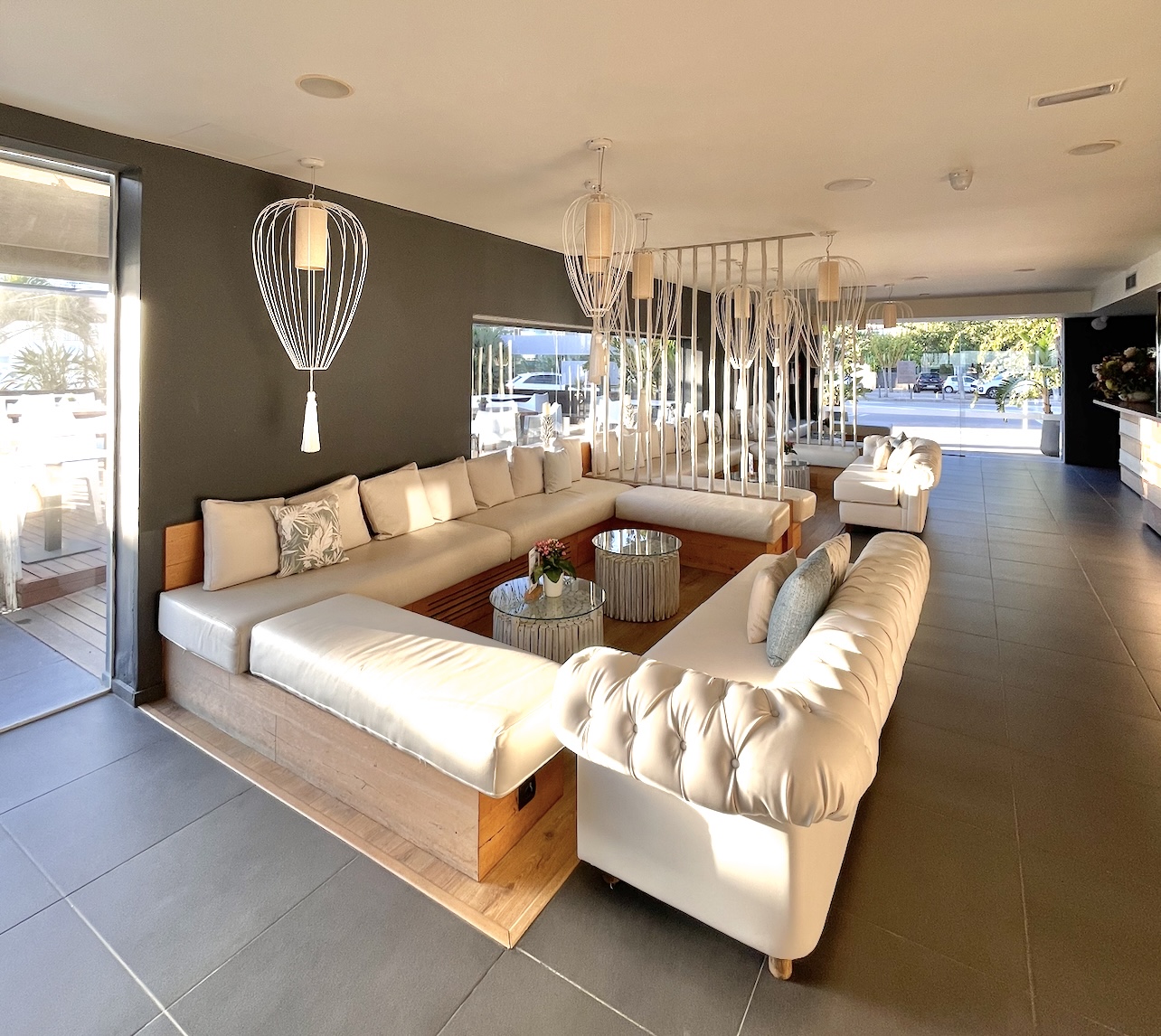 La luz natural no solo sustituye a la iluminación artificial, sino que crea una atmósfera más abierta y positiva. Los espacios configurables permiten adaptar el evento al número de asistentes y al ritmo de la jornada: una zona central para el DJ, áreas más tranquilas para conversar y una terraza donde disfrutar del aire libre.